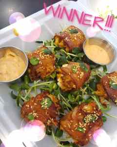 We submitted our “mayo” side dish on Friday. The bacon wrapped kimchi potato salad drenched in Blue Plate (the sponsor, of course) and deep fried in avocado oil and panko looked and tasted awesome. Melissa did a great job coming up with the recipe and with the help of Jessica on the fryer and me on the presentation, we were super stoked to submit our dish. Once we heard what others submitted, we were feeling pretty good about finishing top 10.
